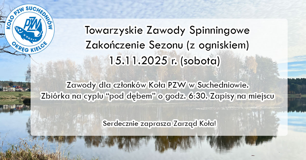Zarząd Koła PZW w Suchedniowie zaprasza wszystkich członków Koła na Towarzyskie Zawody Spinningowe na zakończenie sezonu, które odbędą się w sobotę 15.11.2025 r.